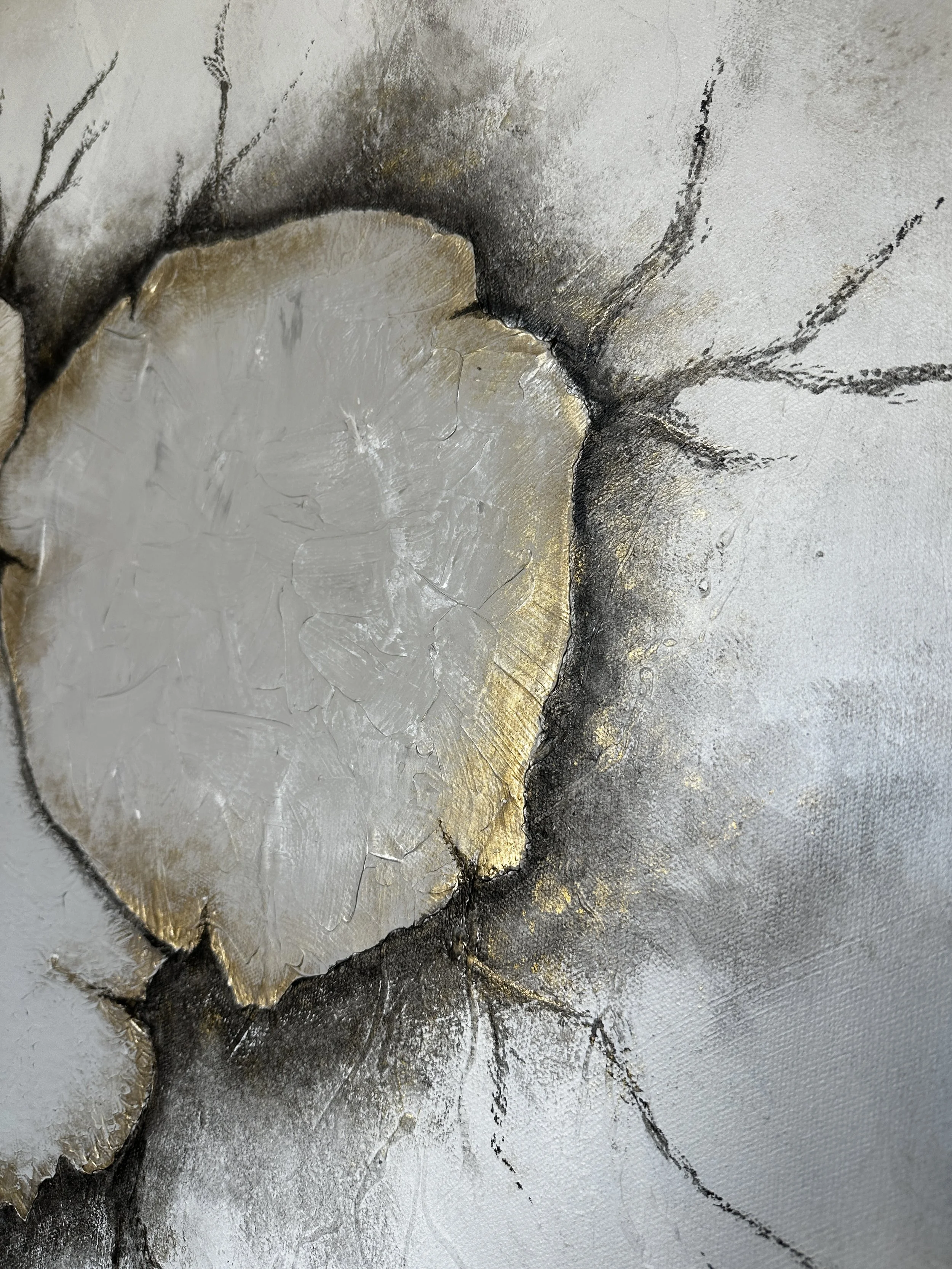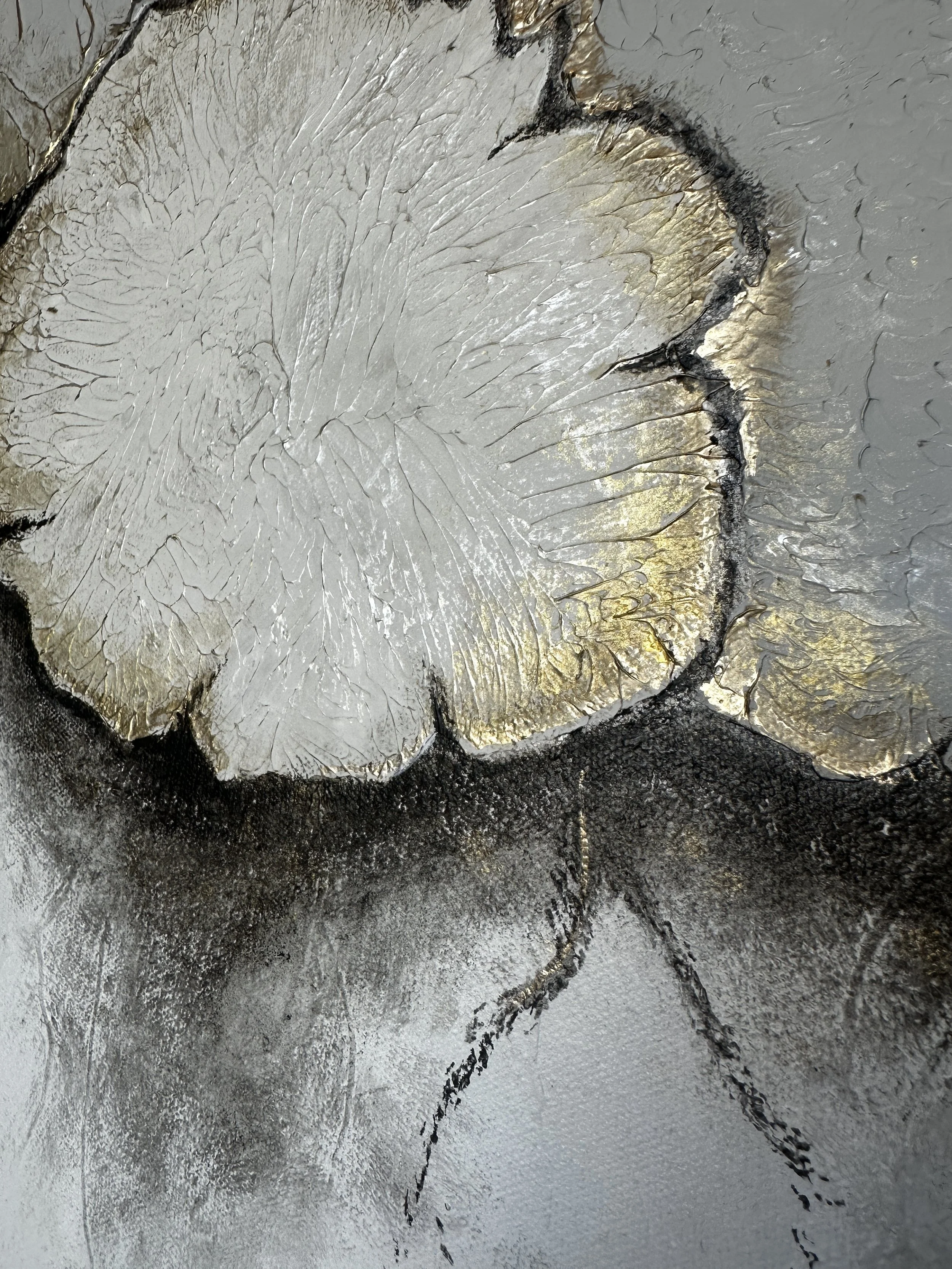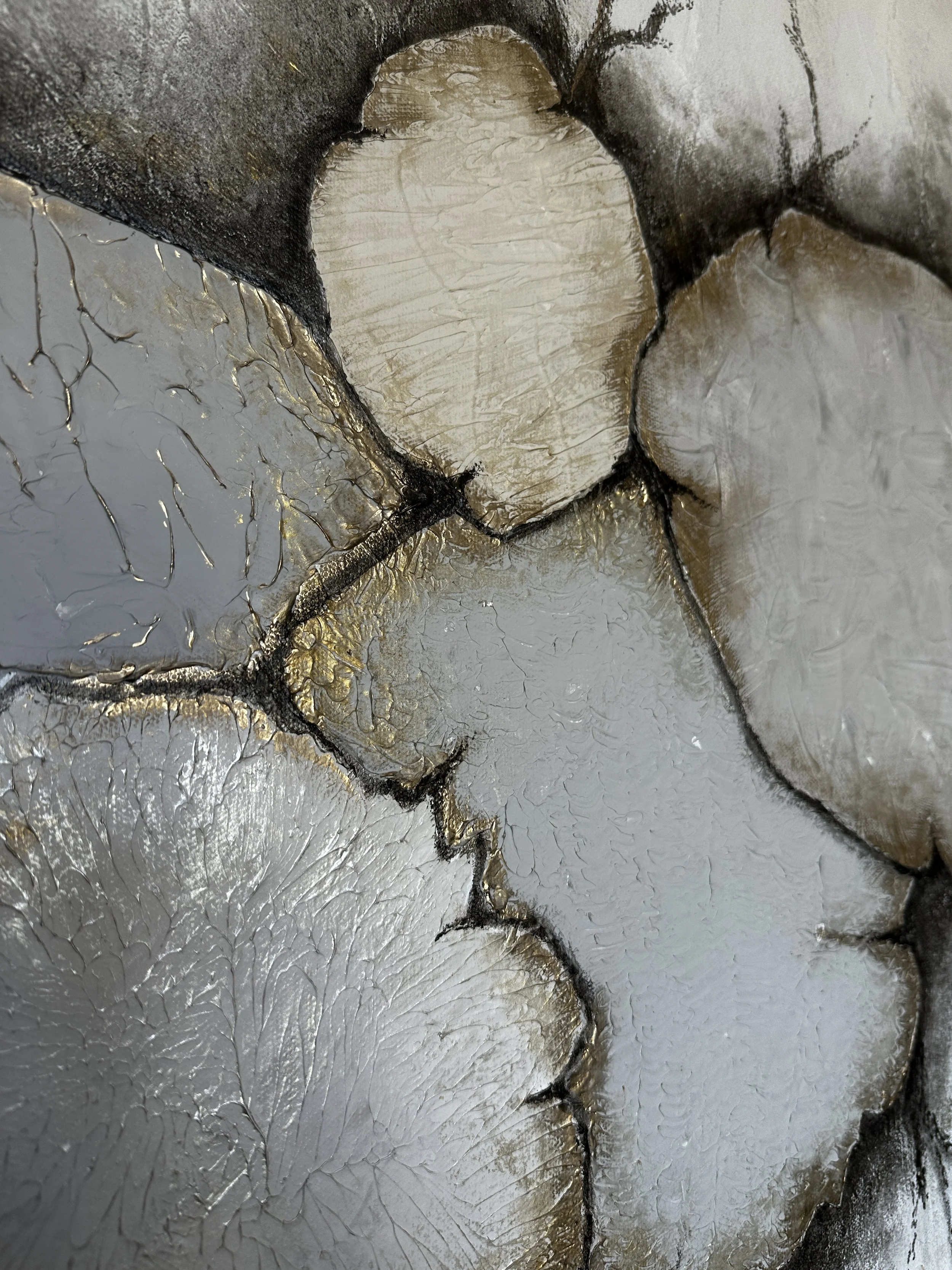 Fissured Bloom is a composition with six irregular, stone-like shapes clustered together in the center. These shapes have a textured, cracked surface with metallic shades of gold, silver, and bronze that create a reflective quality. The edges of the shapes are highlighted in gold, contrasting with the darker, smoky black shading that radiates outward, giving the impression of depth and shadow. Fine black lines extend from the dark shading, resembling cracks or roots spreading into the surrounding neutral beige and gray background, which has a subtle gradient effect from darker at the top to lighter at the bottom. The overall effect is organic and mineral-like, combining natural and metallic elements in a balanced, harmonious arrangement.
