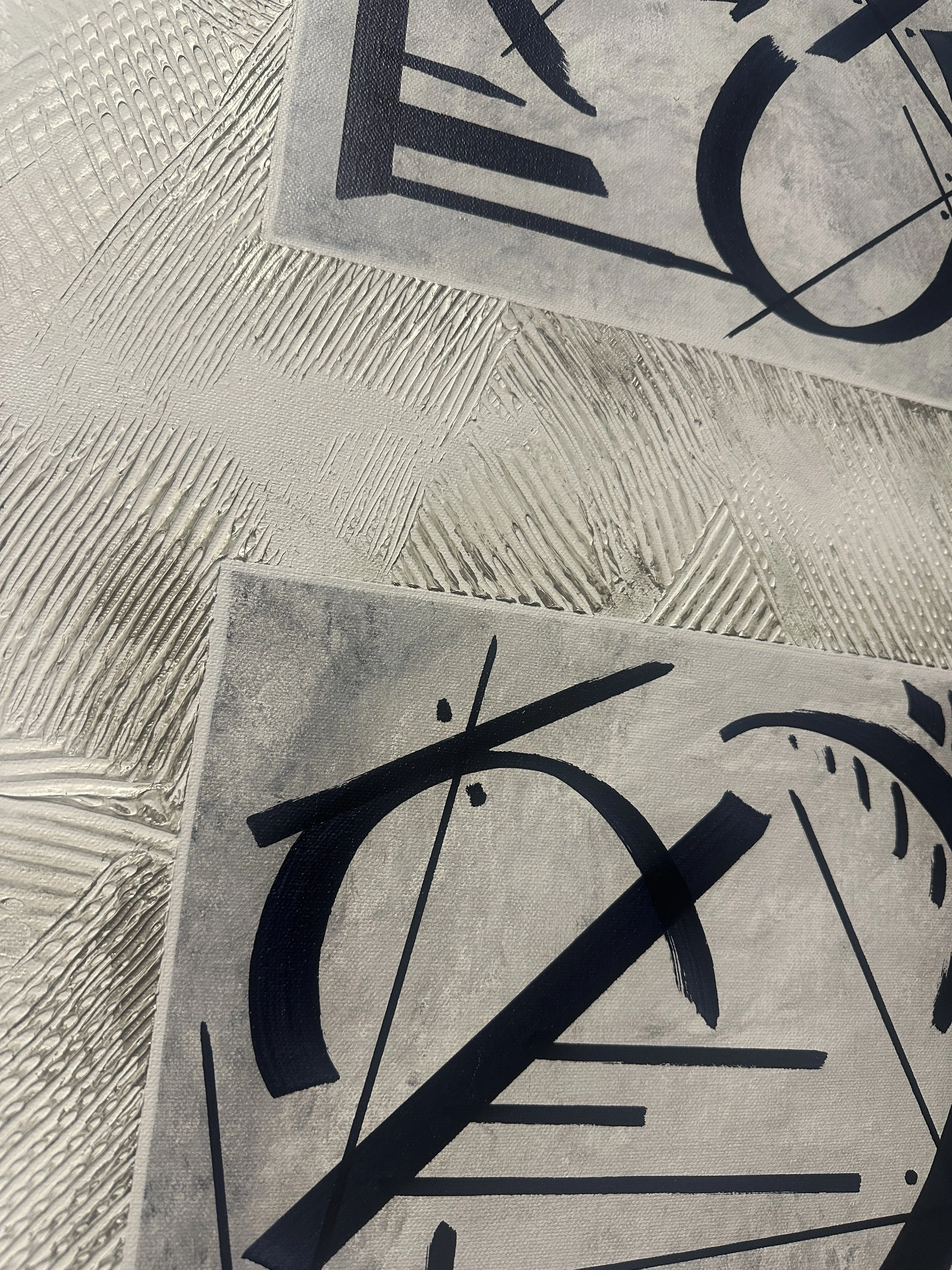 Scripted Enigma is a mysterious symphony unfolds across the intimately scaled canvas, inviting the viewer into a world where ancient echoes and contemporary abstraction converge. This mesmerizing piece, delicately sculpted using acrylics and textured mediums, presents an intricate tableau of organic cryptic scripture encased within structured boxes, each pulsating with narrative potential.