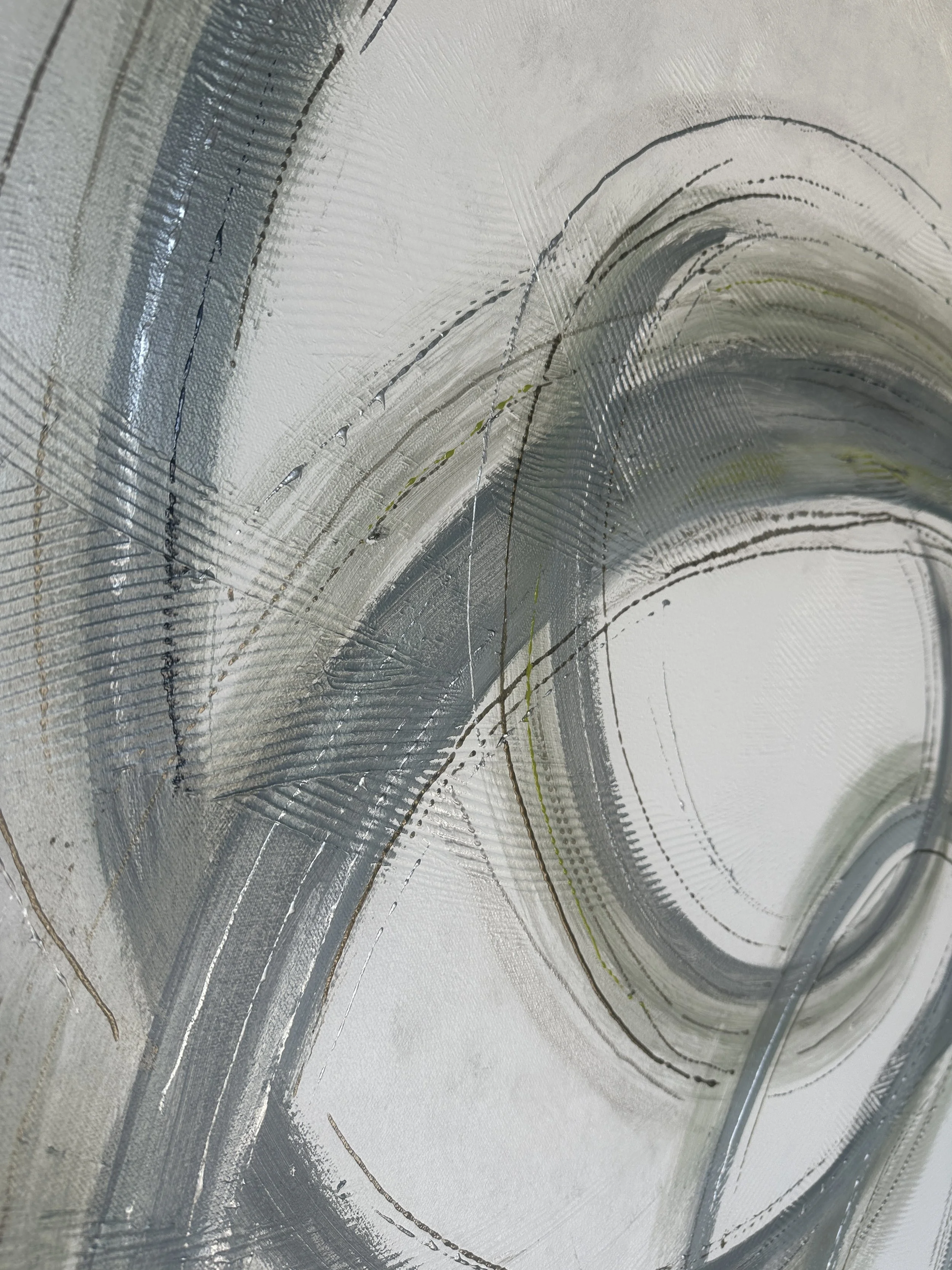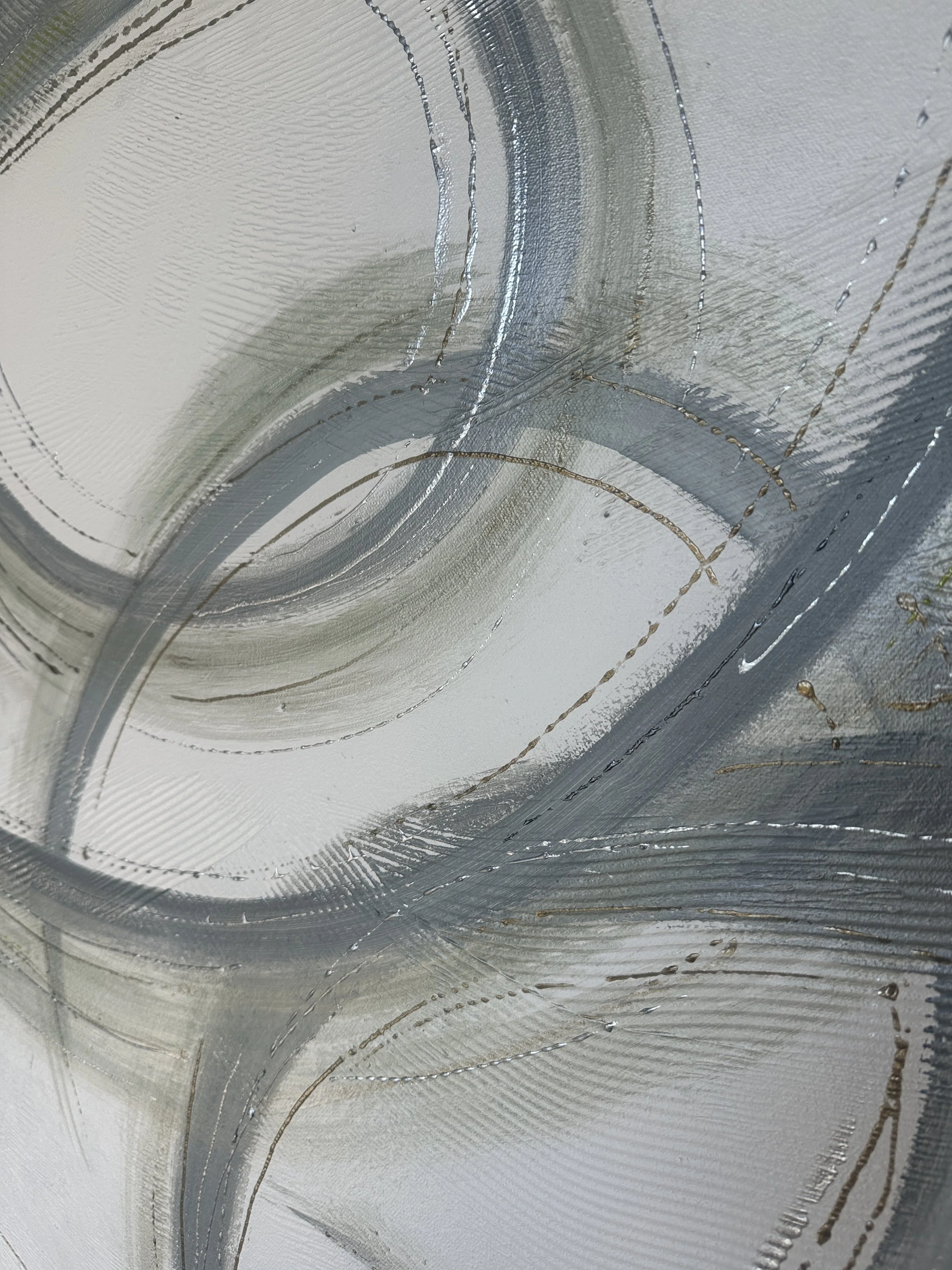 Soft Swerve unfolds as a delicate interplay of sweeping curves and interlaced loops, rendered in a palette of pale greens, grays, whites, silver, and black. Against a muted beige backdrop, the composition balances movement and calm, creating a rhythm that feels both spontaneous and intentional. The brushstrokes possess a tactile quality, their textured layers lending depth and dimension that invite closer contemplation.
