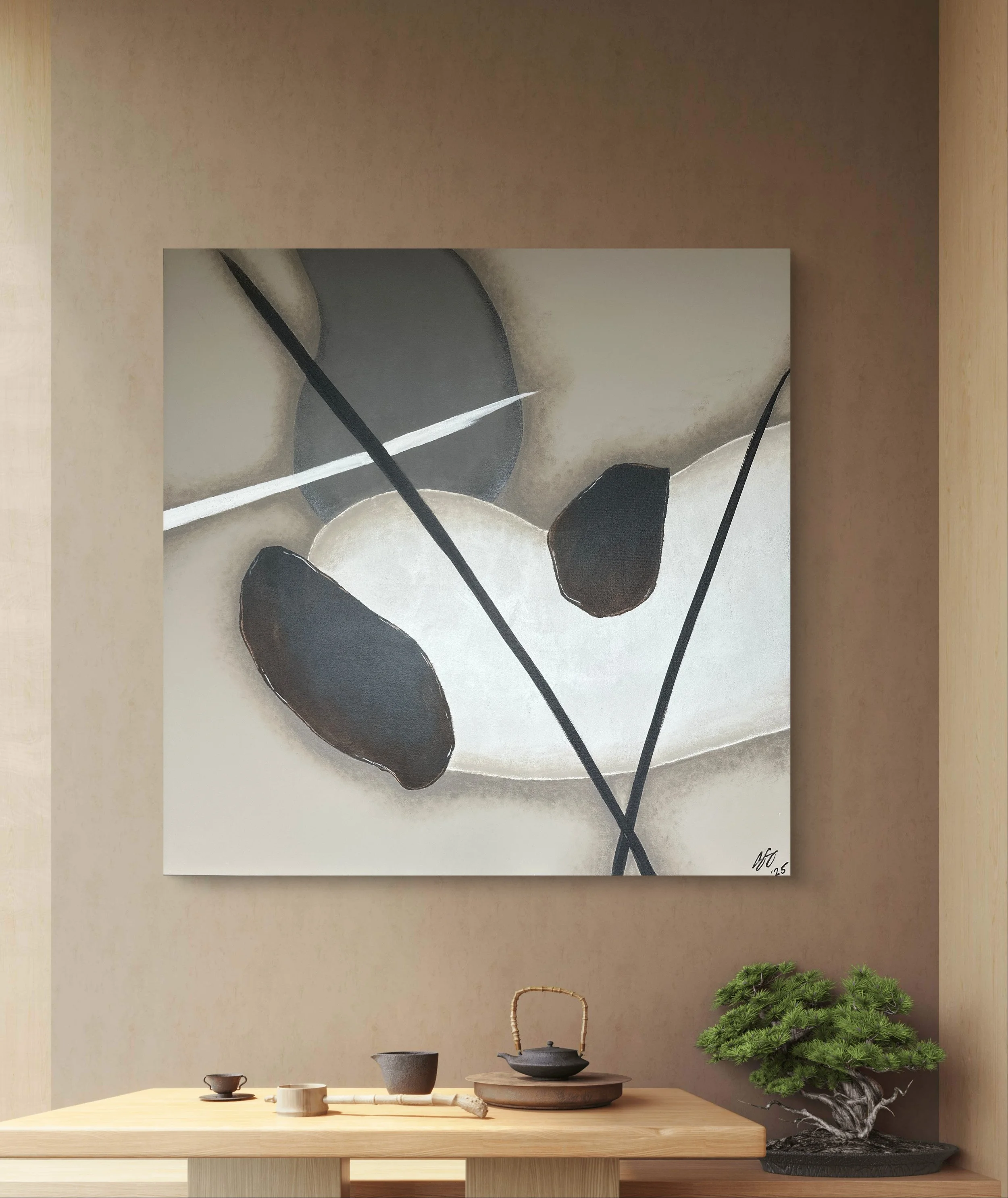 Stone Bolt emerges as a poised exploration of form and tension, where organic shapes and precise lines converge to create a landscape of quiet energy. The composition centers on a pale oval that feels both grounded and ethereal, its soft edges inviting contemplation while suggesting subtle movement beneath the surface. Darker irregular forms appear like shadows or remnants, carefully positioned to frame and challenge the central shape without overwhelming it.